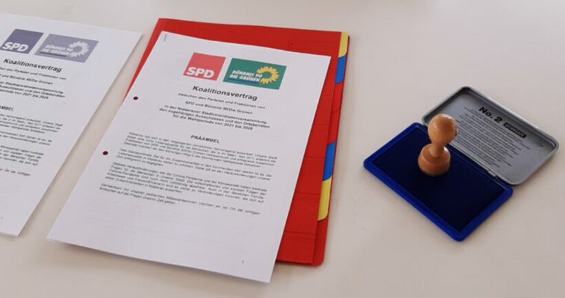 Zum Abschluss des Termins wurde der Vertrag öffentlich von Sabine Forchel, Vinzent Bailey (SPD) und Gerrit Rippen und Viola Haßdenteufel (GRÜNE) unterzeichnet.